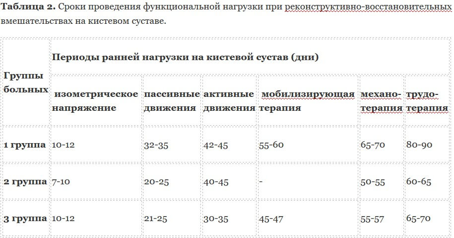 Таблица 2. Сроки проведения функциональной нагрузки при реконструктивно-восстановительных вмешательствах на кистевом суставе.