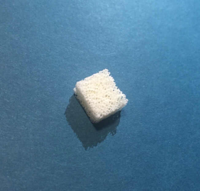 Остекондуктивный и остеоиндуктивный пористый биоматериал для заполнения объема костного дефекта или полости. Избирательное связывание костными сГАГ тромбоцитов крови (ТК) позволяет создать химически фиксированную, стабильную концентрацию ТК на материале, немедленно запуская каскад реакций формирования костного матрикса, без дополнительных манипуляций с кровью пациента. Материал характеризуется высокой биосовместимостью с костной тканью. Низкая антигенность, не иммуногенен.